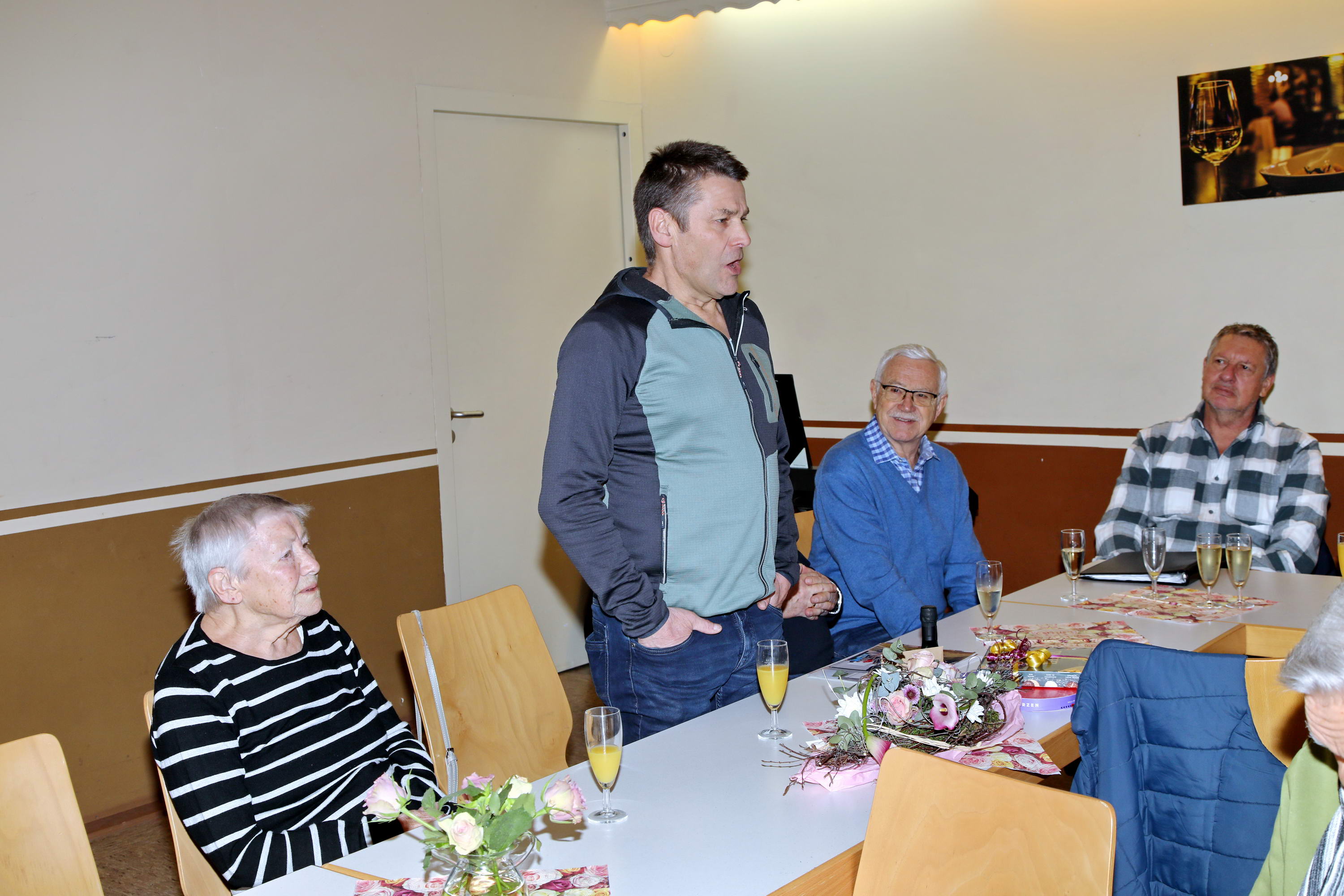 Auch in diesem Jahr kamen die Sängerinnen und Sänger zur traditionellen Baummessung zusammen – diesmal jedoch aus einem ganz besonderen Anlass: dem 10-jährigen Jubiläum der Pflanzung der Winterlinde. Zu diesem Anlass war erneut Emmi Wesp in Begleitung ihres Sohnes Manfred anwesend. Ludwig Wesp, der vor einigen Jahren verstorben ist, fehlte an diesem Tag schmerzlich und wurde in dankbarer Erinnerung gewürdigt. Da der große Saal des Sportheims bereits belegt war, wich man in den kleineren Saal aus, in dem die Tische in U-Form aufgestellt waren. Für das leibliche Wohl war – wie stets – bestens gesorgt. Selbstverständlich standen auch mehrere Liedvorträge des Gemischten Chores auf dem Programm; die Vorbereitungen dafür waren ebenfalls getroffen. So konnte die Jubiläumsfeier in würdigem Rahmen beginnen. |