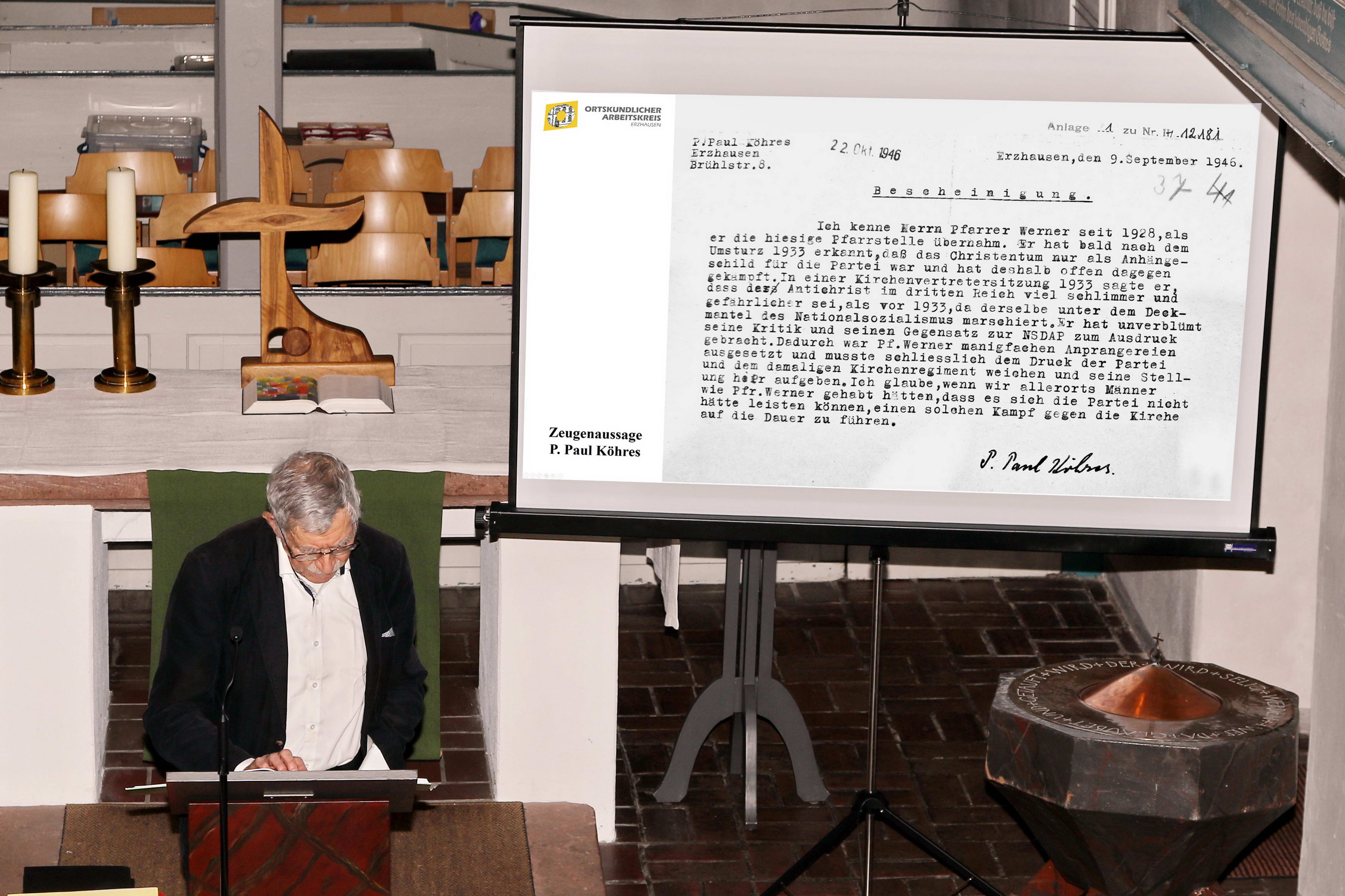 Republik formuliert. Die politische Rolle des Erzhäuser Pfarrers, der sich nach dem Zweiten Weltkrieg einem „Spruchkammerverfahren“ der Alliierten unterziehen musste, lässt sich deshalb auch nicht eindeutig bewerten. Während er in dem zitierten Bericht von 1934 als jemand bezeichnet wurde, der zwar seine Pflicht der Kirche gegenüber erfüllen wollte, der doch trotzdem noch ein guter Nationalsozialist sei, so wird hier der Zwiespalt deutlich, dem sich der Autor des Berichts bewusst war. Als nach dem Krieg Peter Paul Köhres aus Erzhausen über den Pfarrer äußert, dass dieser unverblümt seine Kritik und seinen Gegensatz zur NSDAP zum Ausdruck gebracht habe, weil er erkannt habe, dass der Antichrist im Dritten Reich viel schlimmer und gefährlicher sei als vor 1933, so brachte er damit eine andere Seite des Gemeindepfarrers zum Ausdruck. |
