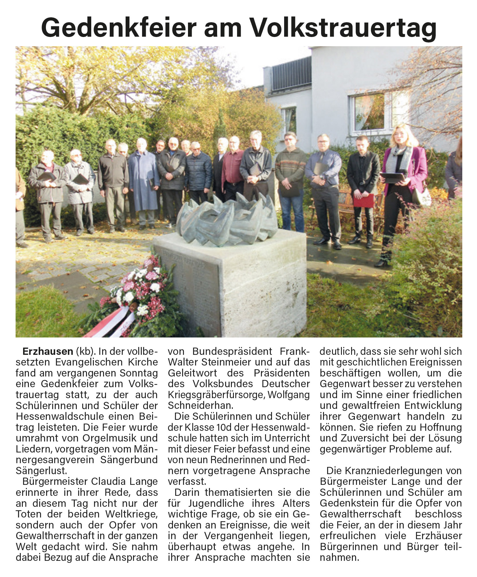 Volkstrauertages hier in Erzhausen erstmals ausgefallen. In diesem Jahr hat Klaus Becker die Organisation des Volkstrauertages übernommen. Er ist Autor des Buches „Orte des Gedenkens“, das vor zwei Jahren erschienen ist und von den drei Kriegsdenkmalen hier an der evangelischen Kirche handelt. Er weist in seinem Buch darauf hin, dass das Kriegsdenkmal ursprünglich eine breitere Bedeutung hatte als an die gefallenen Soldaten zu erinnern, deren Namen später auf den Tafeln angebracht waren. Sie erinnern an die Opfer – und mahnen die Lebenden. Sie bewahren Geschichte, stiften Verantwortung und rufen dazu auf, sich für Frieden, Menschlichkeit und Demokratie einzusetzen.