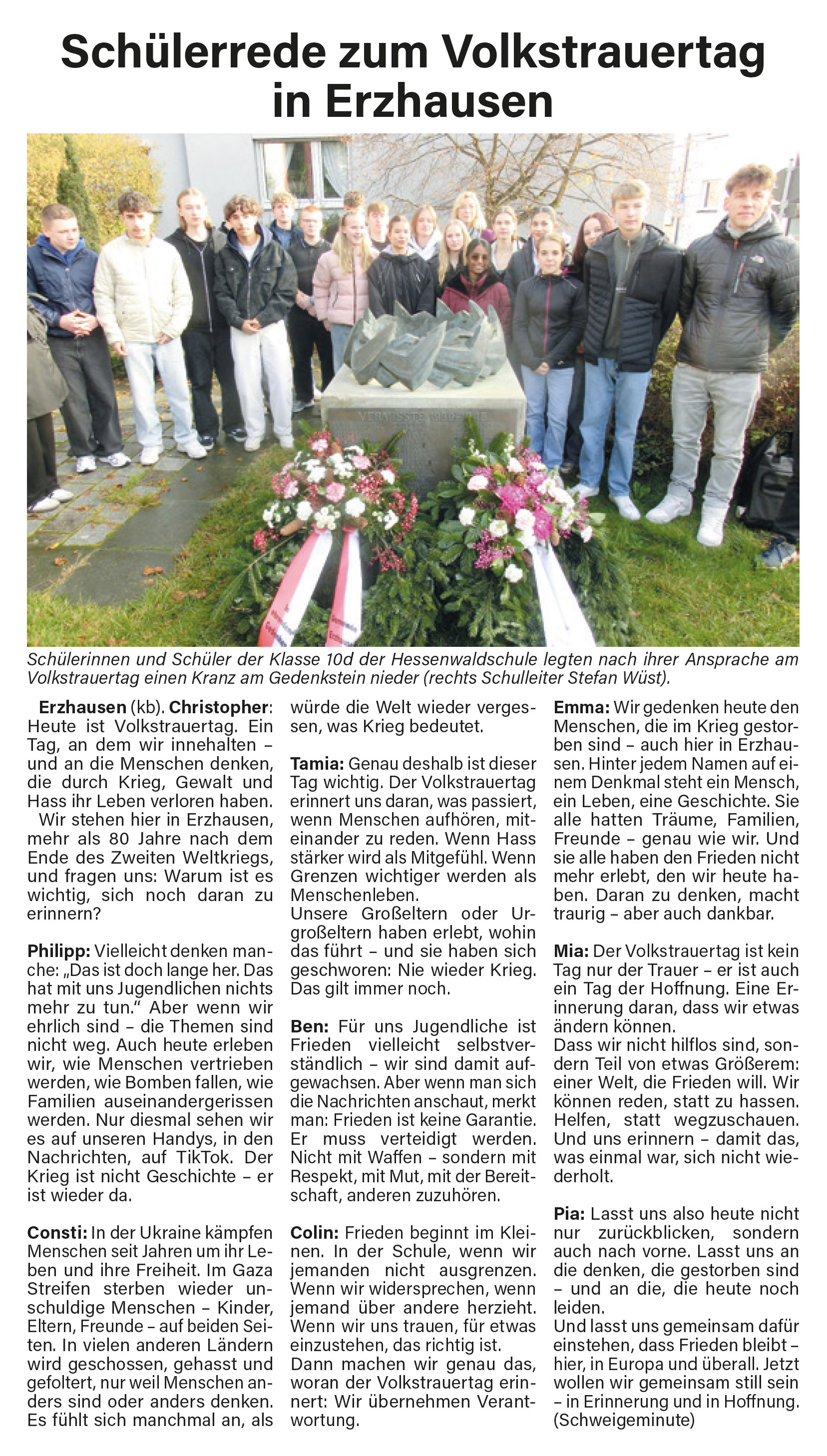 Christopher: Heute ist Volkstrauertag. Ein Tag, an dem wir innehalten - und an die Menschen denken, die durch Krieg, Gewalt und Hass ihr Leben verloren haben. Wir stehen hier in Erzhausen, mehr als 80 Jahre nach dem Ende des Zweiten Weltkriegs, und fragen uns: Warum ist es wichtig, sich noch daran zu erinnern? |