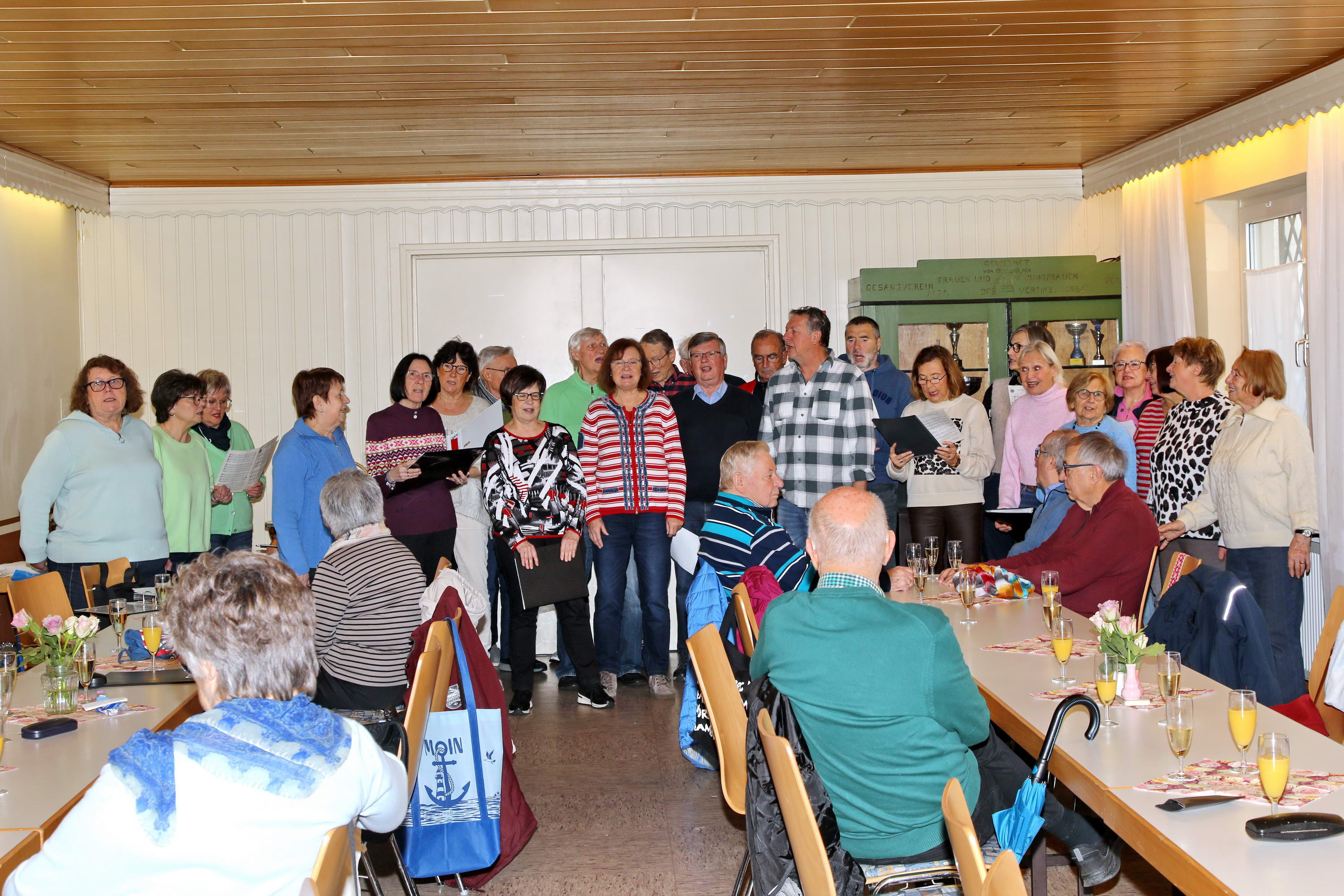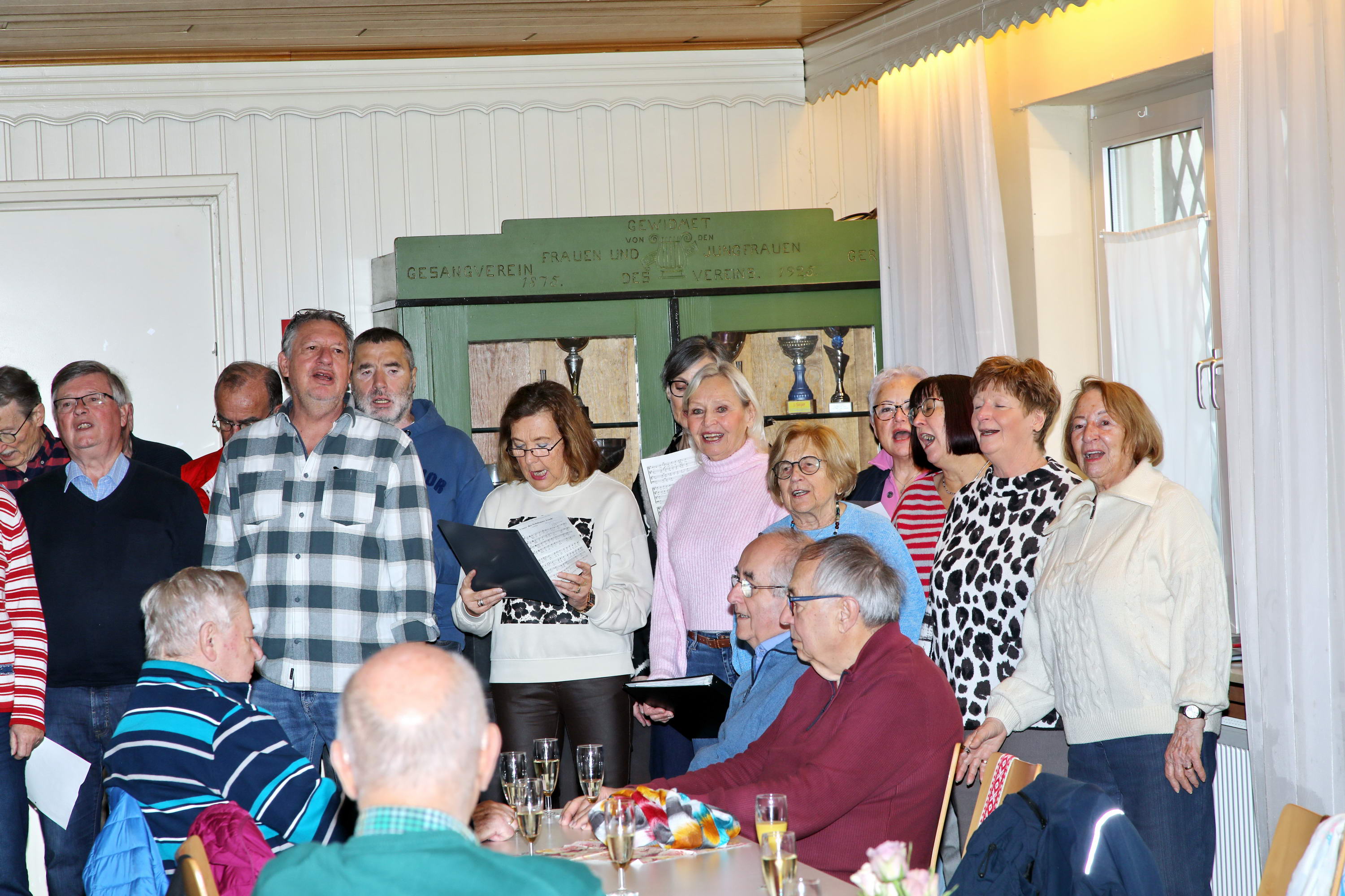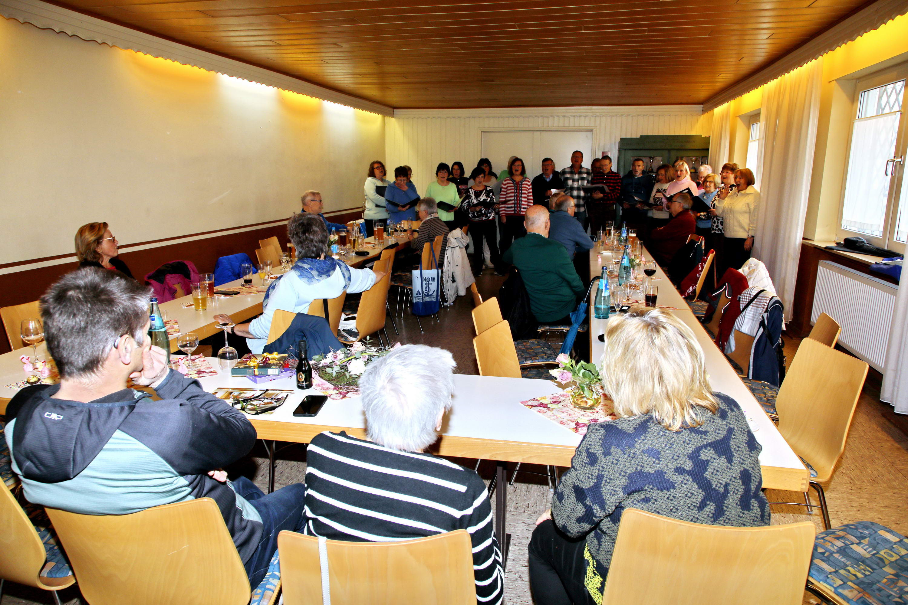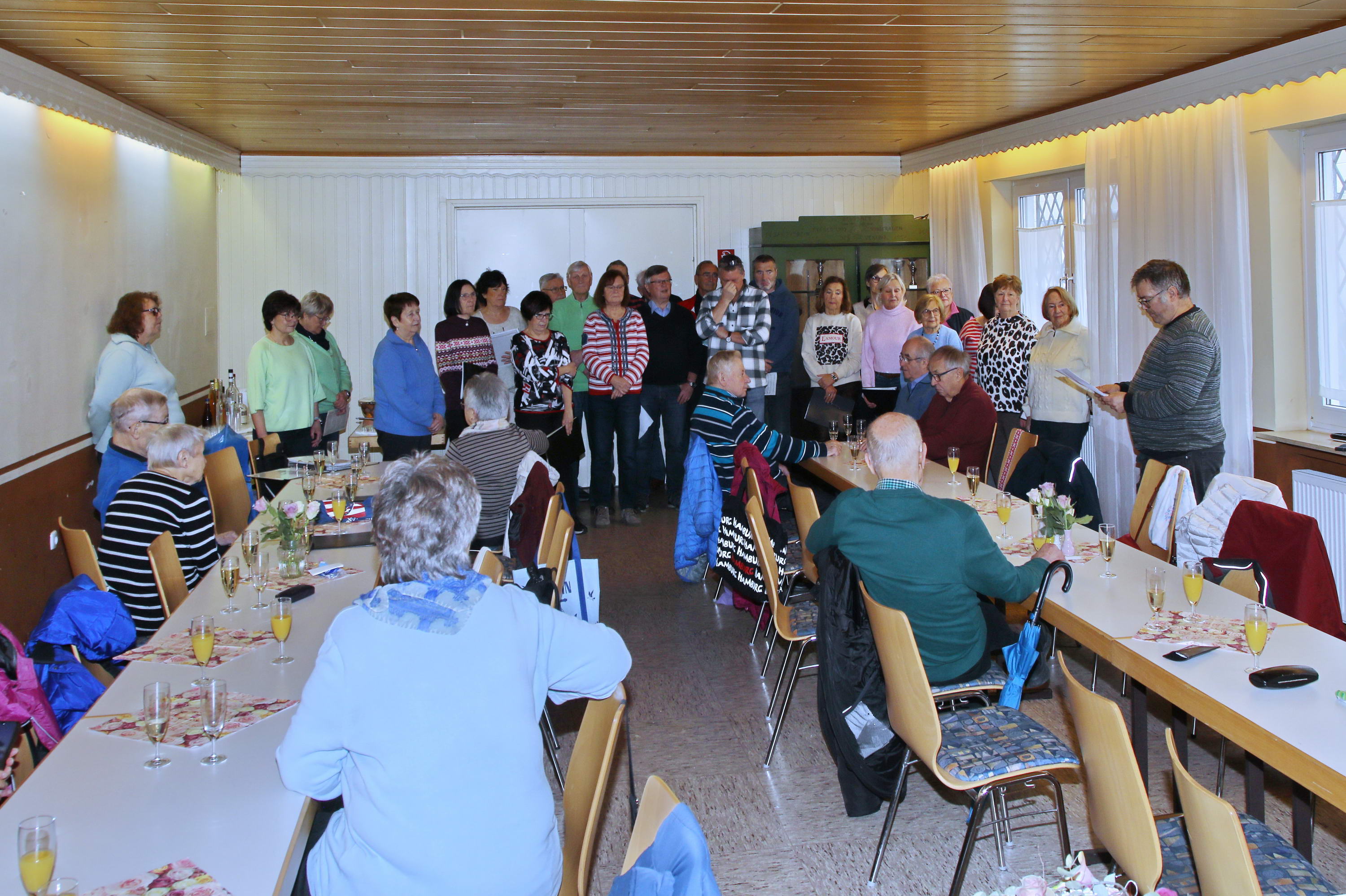 Auch in diesem Jahr kamen die Sängerinnen und Sänger zur traditionellen Baummessung zusammen – diesmal jedoch aus einem ganz besonderen Anlass: dem 10-jährigen Jubiläum der Pflanzung der Winterlinde. Zu diesem Anlass war erneut Emmi Wesp in Begleitung ihres Sohnes Manfred anwesend. Ludwig Wesp, der vor einigen Jahren verstorben ist, fehlte an diesem Tag schmerzlich und wurde in dankbarer Erinnerung gewürdigt. Da der große Saal des Sportheims bereits belegt war, wich man in den kleineren Saal aus, in dem die Tische in U-Form aufgestellt waren. Für das leibliche Wohl war – wie stets – bestens gesorgt. Selbstverständlich standen auch mehrere Liedvorträge des Gemischten Chores auf dem Programm; die Vorbereitungen dafür waren ebenfalls getroffen. So konnte die Jubiläumsfeier in würdigem Rahmen beginnen. |