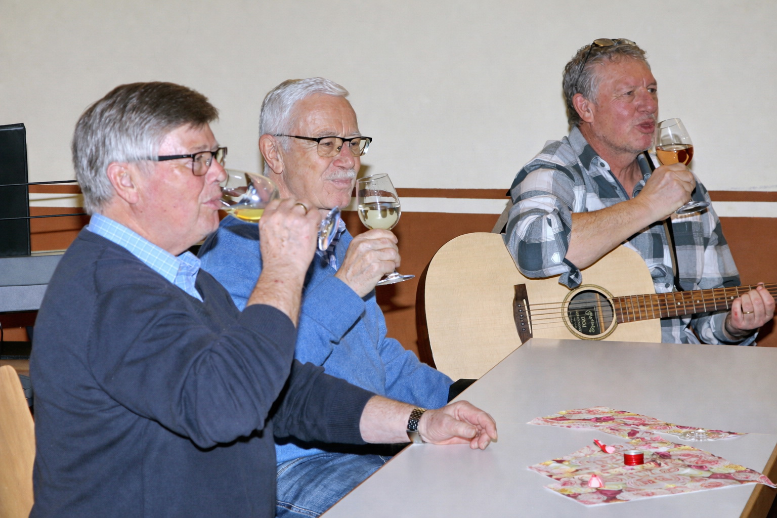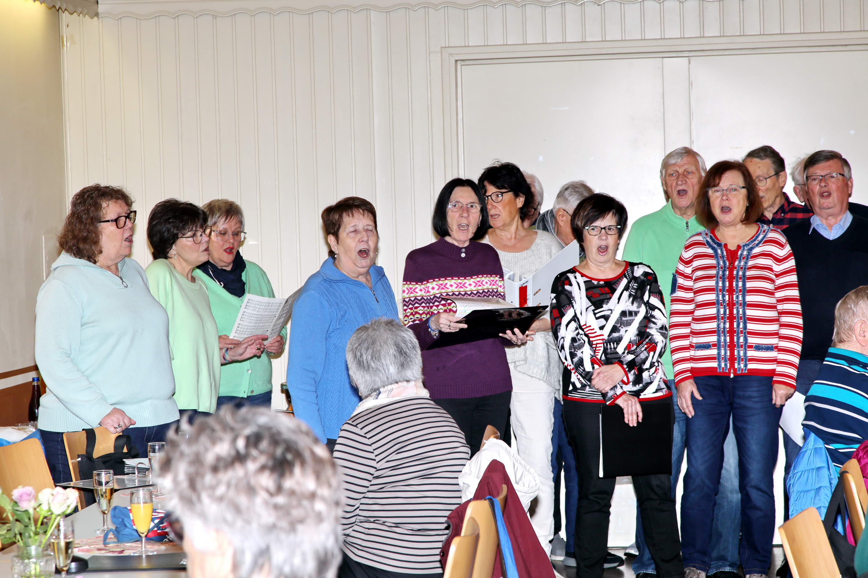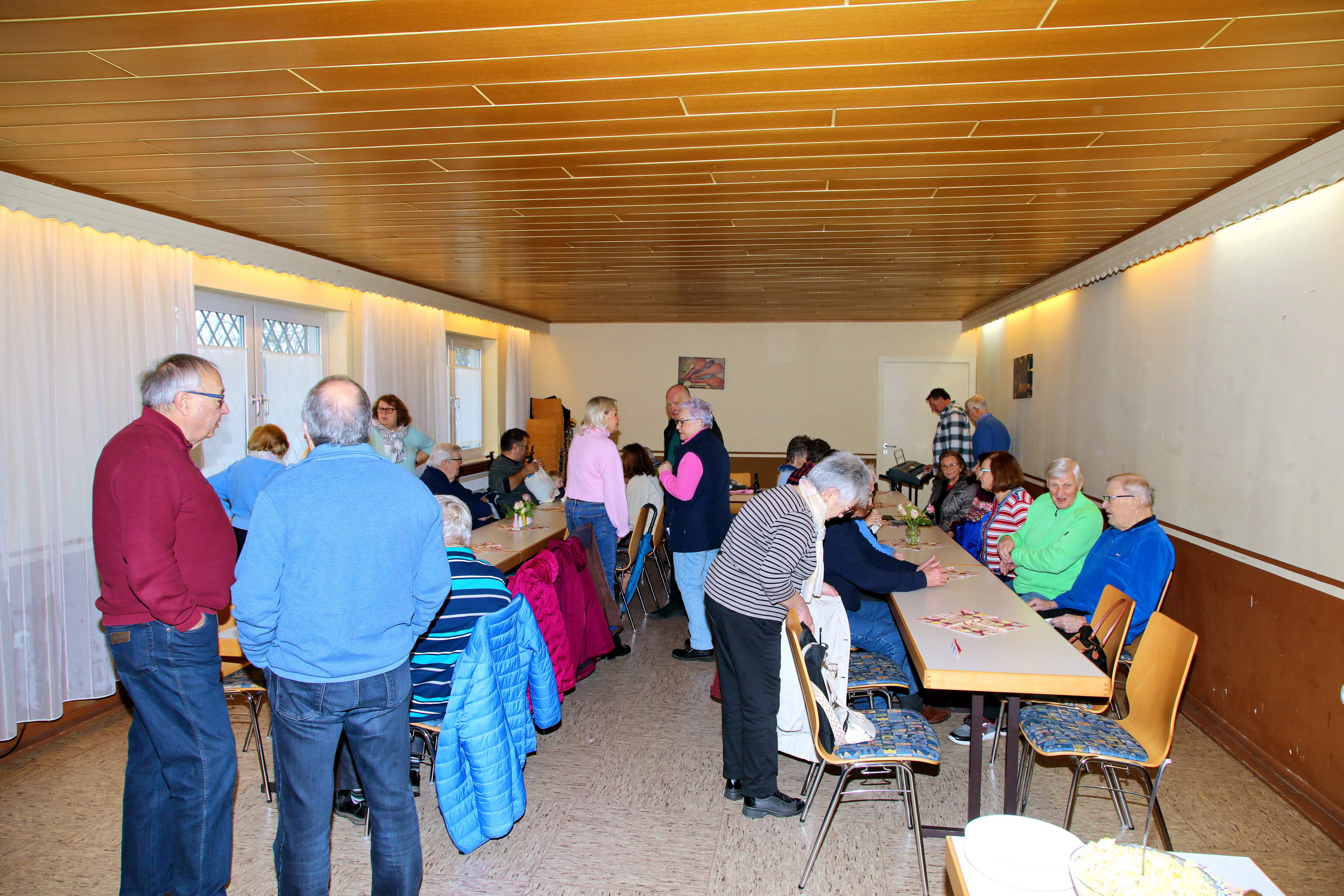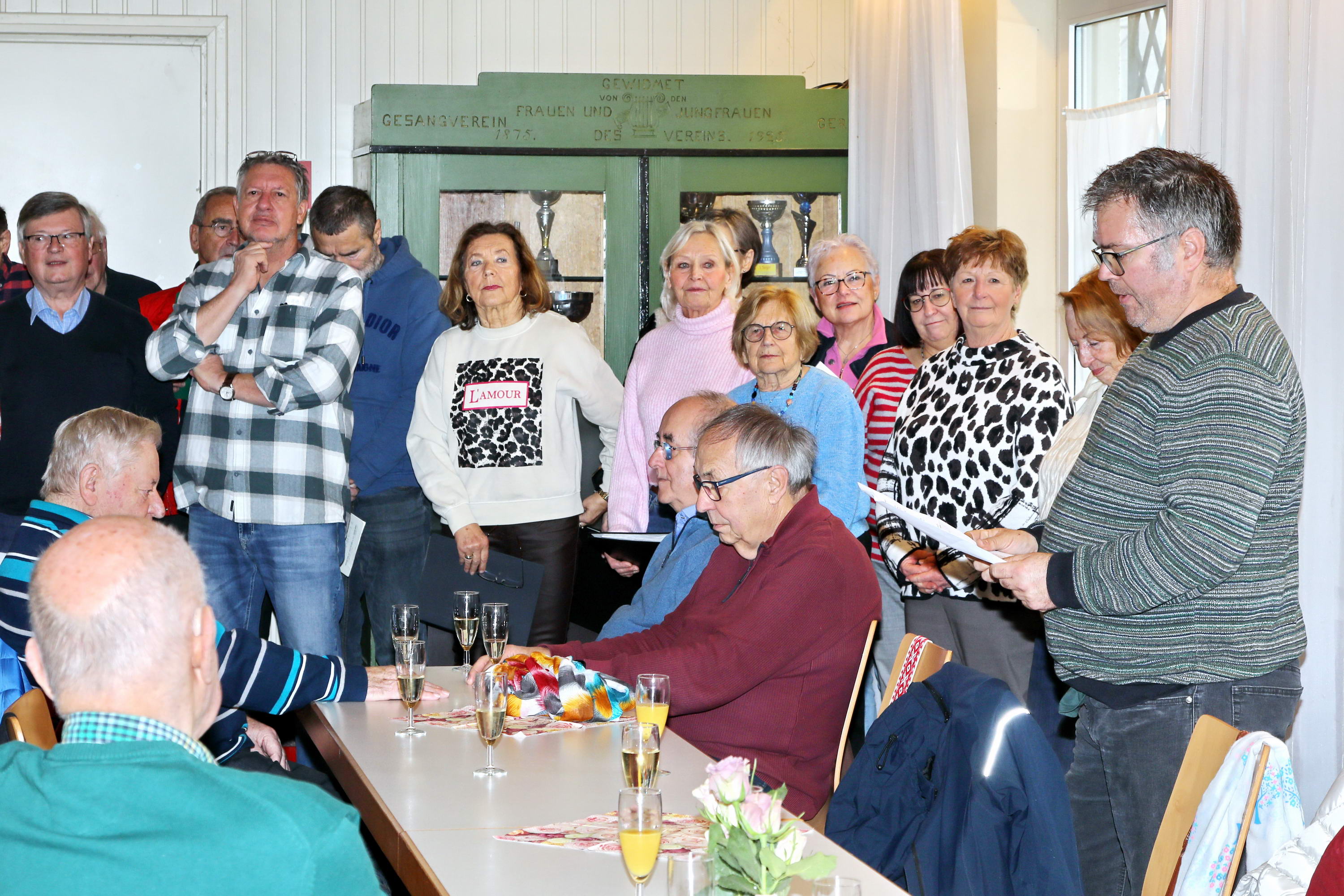 Auch in diesem Jahr kamen die Sängerinnen und Sänger zur traditionellen Baummessung zusammen – diesmal jedoch aus einem ganz besonderen Anlass: dem 10-jährigen Jubiläum der Pflanzung der Winterlinde. Zu diesem Anlass war erneut Emmi Wesp in Begleitung ihres Sohnes Manfred anwesend. Ludwig Wesp, der vor einigen Jahren verstorben ist, fehlte an diesem Tag schmerzlich und wurde in dankbarer Erinnerung gewürdigt. Da der große Saal des Sportheims bereits belegt war, wich man in den kleineren Saal aus, in dem die Tische in U-Form aufgestellt waren. Für das leibliche Wohl war – wie stets – bestens gesorgt. Selbstverständlich standen auch mehrere Liedvorträge des Gemischten Chores auf dem Programm; die Vorbereitungen dafür waren ebenfalls getroffen. So konnte die Jubiläumsfeier in würdigem Rahmen beginnen. |