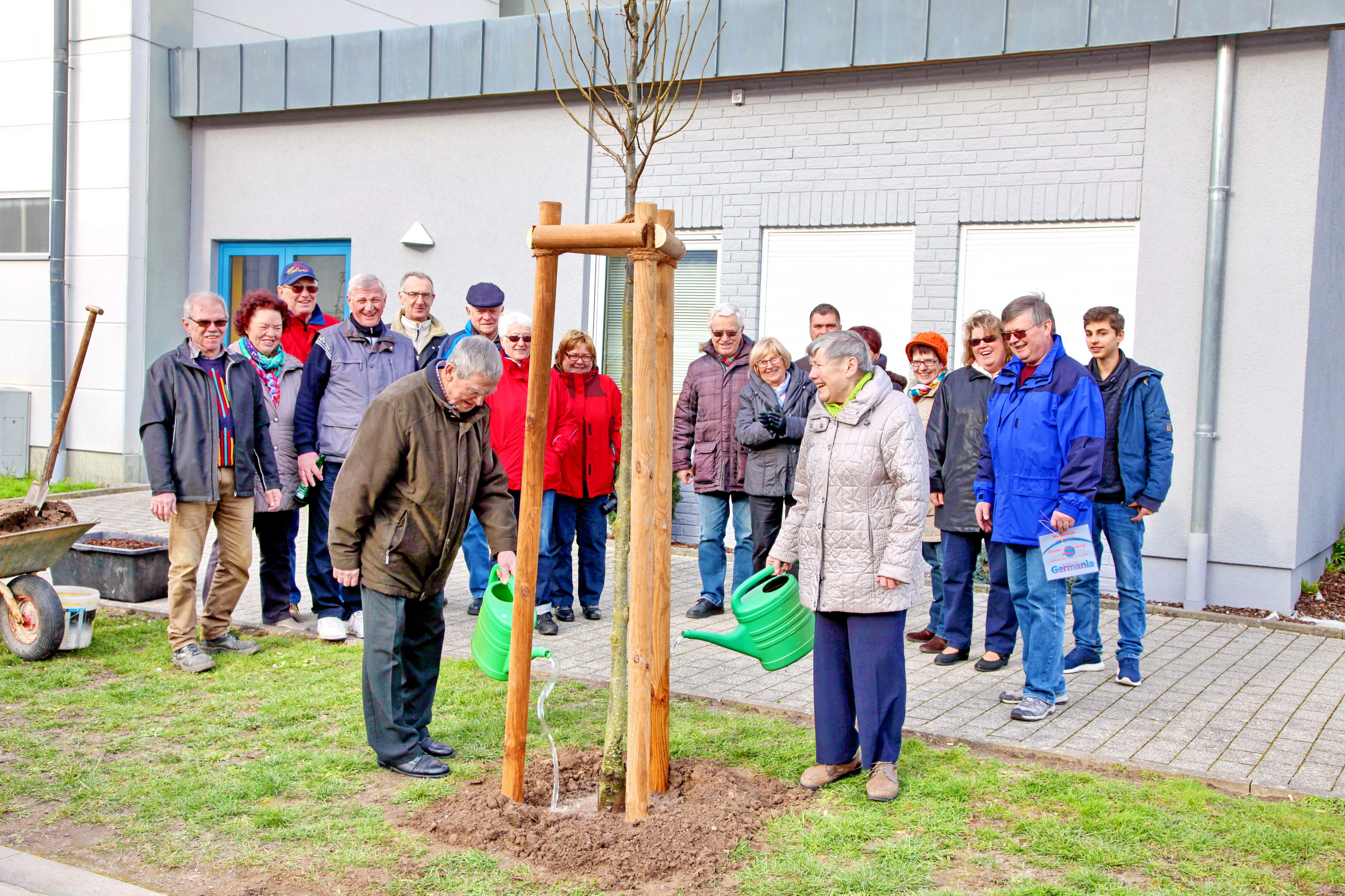 Am 11. Oktober 2015 wurde bei der Keis Sängerehrung in Erzhausen unser Ludwig Wesp für 70 Jahre aktives Singen geehrt. 2016 feierten Emmi und Ludwig die Eiserne Hochzeit und luden den gesamten Chor zur Feier ein. Eine wundervolle Feier mit viel Freude und Esprit. Das nahm die Germania am 26.02.2016 zum Anlass, dem Paar für 65 Ehejahre mit der Pflanzung einer Winterlinde ein ehrendes Andenken zu setzen. Der Grundstein für eine neue Vereinstradition war gelegt. Jedes Jahr treffen sich die Sängerinnen und Sänger, um den Lindenbaum zu messen und ein ehrendes Andenken an Emmi und Ludwig zu bewahren. Erwin und Bastian Endres hatten den Lindenbaum und alles für die Pflanzung Erforderliche damals organisiert und hier her zum Sportheim an den Pflanzungsort gebracht. Die Winterlinde Sorte Rancho kommt ursprünglich aus Amerika und wird ca. 10 bis 12 Meter hoch. Etwa 6 bis 8 Meter breit und hat einen kompakten und langsamen Wuchs. Sie ist sehr resistent gegen Hitze, Wind, Streusalz und kommt recht gut mit Bodendichte zurecht. Sie ist sehr winterhart und stadtklimafest, weitgehend Blattlausresistent und bekommt daher eher selten den sogenannten Honigtau. Da die Winterlinde Baum des Jahres 2016 war, konnte die Baumauswahl schnell getroffen werden. Es gab aber noch mehr Gründe für die Linde, dazu später mehr. Damals hatte der heute stattlich herangewachsene Baum einen Stammumfang von 15 cm, und wurde in einer feierlichen Zeremonie gepflanzt. Auch Ludwig und Emmi ließen es sich nicht nehmen, persönlich Hand anzulegen. Nach getaner Arbeit wurde der Baum von Ludwig und Emmi auch ordentlich angegossen. Im Anschluss wurde bei gemütlichem Beisammen sein der Baum, das Ehepaar Wesp mit Familie und die Sängerinnen und Sänger der Chorgemeinschaft mit einem Schladerer Himbeergeist begossen und gefeiert. Am 25.02.2017 trafen sich die Sänger und Sängerinnen um den Baum erneut zu vermessen. Innerhalb eines Jahres, hat die Linde 1 cm im Stammumfang zulegen können. Bei dieser Messung wurde auch ein Schild mit Widmung zur eisernen Hochzeit im Baum aufgehängt. Die Messung des Stammumfangs ergab 16 cm. In diesem Jahr wurde die Gemeine Fichte (Picea abies) zum Baum des Jahres gekürt. Die nächste Messung fand am 24.02.2018 statt. 16,8 cm waren es in diesem Jahr. Erneut ein Zuwachs, diesmal um 8mm. Vor der Messung haben Erwin und Bastian Endres die Baumbindung erneuert. In diesem Jahr war die Ess-Kastanie (Castanea sativa) Baum des Jahres.