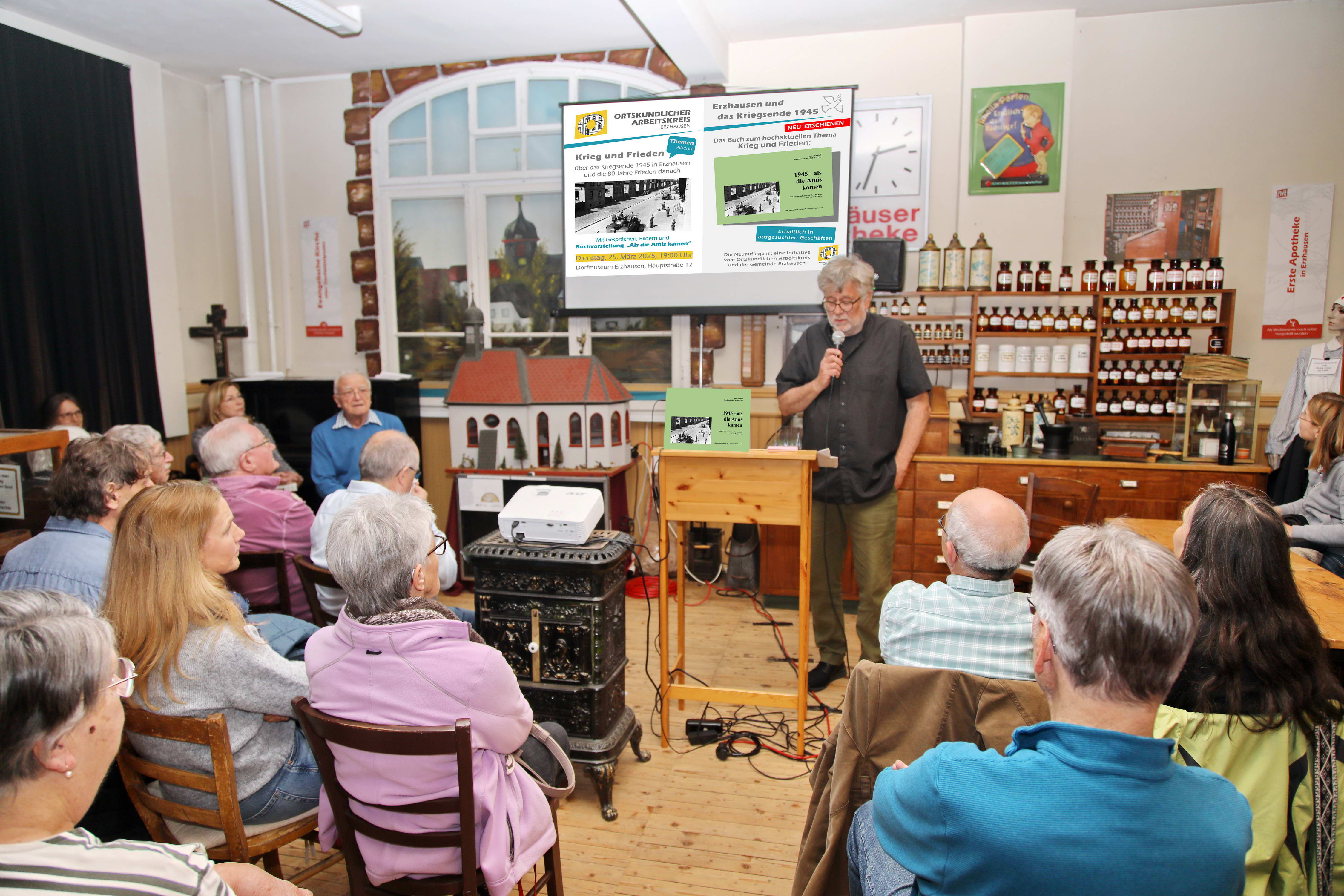 Am gleiche Tag, also am 23. März 2025, abends um 19 Uhr, wurde dann das neu herausgebrachte Buch im Dorfmuseum vorgestellt. In dieser Veranstaltung standen die Zeitzeugenberichte und die Empfindungen der Menschen damals im Mittelpunkt. „Was lösen Erinnerungen an damals bei der Kriegs- und Nachkriegsgeneration aus?" hieß die Themenstellung. Die Kriegshandlungen waren für Erzhausen vorbei, aber nicht der Krieg in Deutschland. Die Amerikaner waren am 25.3.45 zunächst Feinde und Besatzer, gegen die noch Familienangehörige kämpfen mussten – Freunde wurden sie erst später in einem langsamen Annäherungsprozess. Es folgten 80 Friedensjahre, die wir mit demokratischen Errungenschaften und einem damals unvorstellbaren Wohlstand verbinden. Nur bedürfen diese Errungenschaften der stetigen Vergewisserung, Wertschätzung und Verteidigung – gerade in der heutigen Zeit. Daher gab es diesen Themenabend verbunden mit der Vorstellung der Neuauflage des überarbeiteten Buches von 1996. Neben dem Vortrag von Hans Schmidt, in dem er viele Details aus dem Buch ausführlich beschrieb, gab es eine Video-Grußbotschaft von Ministerin Heike Hofmann, einen bemerkenswerten Vortrag unserer Bürgermeisterin Claudia Lange und eine sehr engagierte Diskussion am Ende der Veranstaltung.