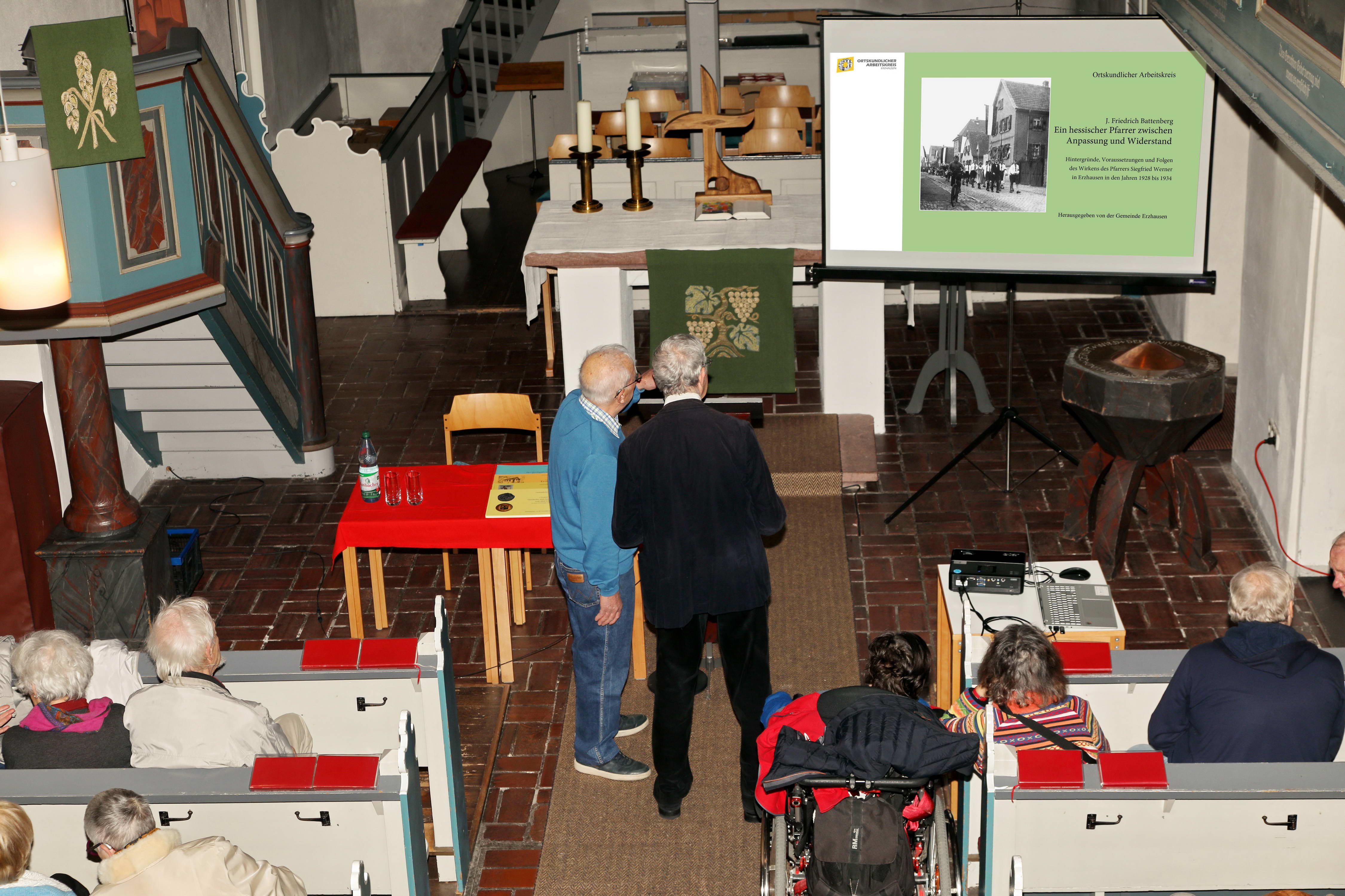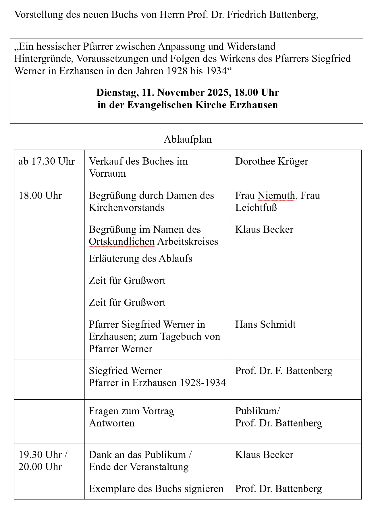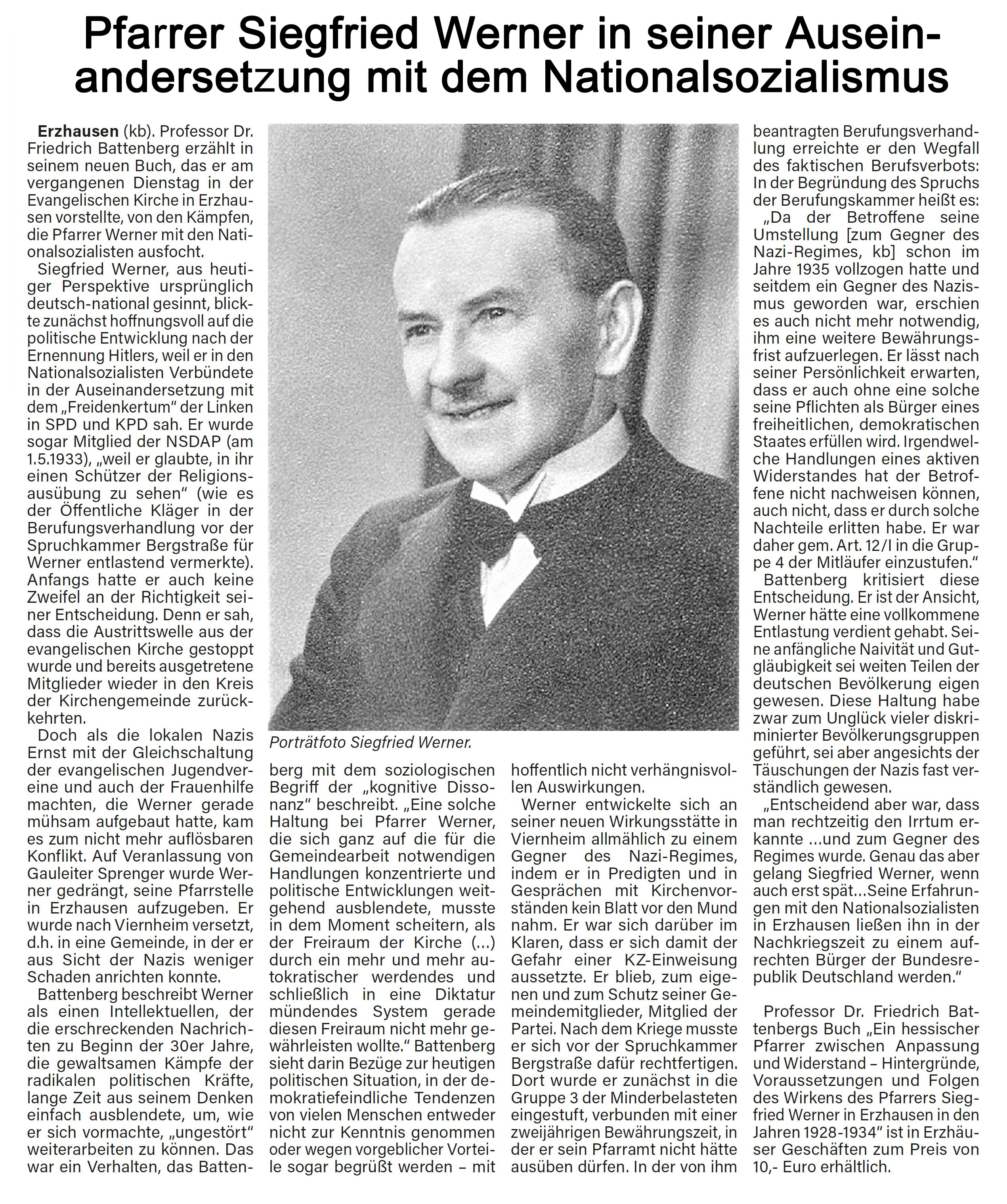 Professor Dr. Friedrich Battenbergs Buch „Ein hessischer Pfarrer zwischen Anpassung und Widerstand – Hintergründe, Voraussetzungen und Folgen des Wirkens des Pfarrers Siegfried Werner in Erzhausen in den Jahren 1928-1934“ ist in Erzhäuser Geschäften zum Preis von 10.- Euro erhältlich. |