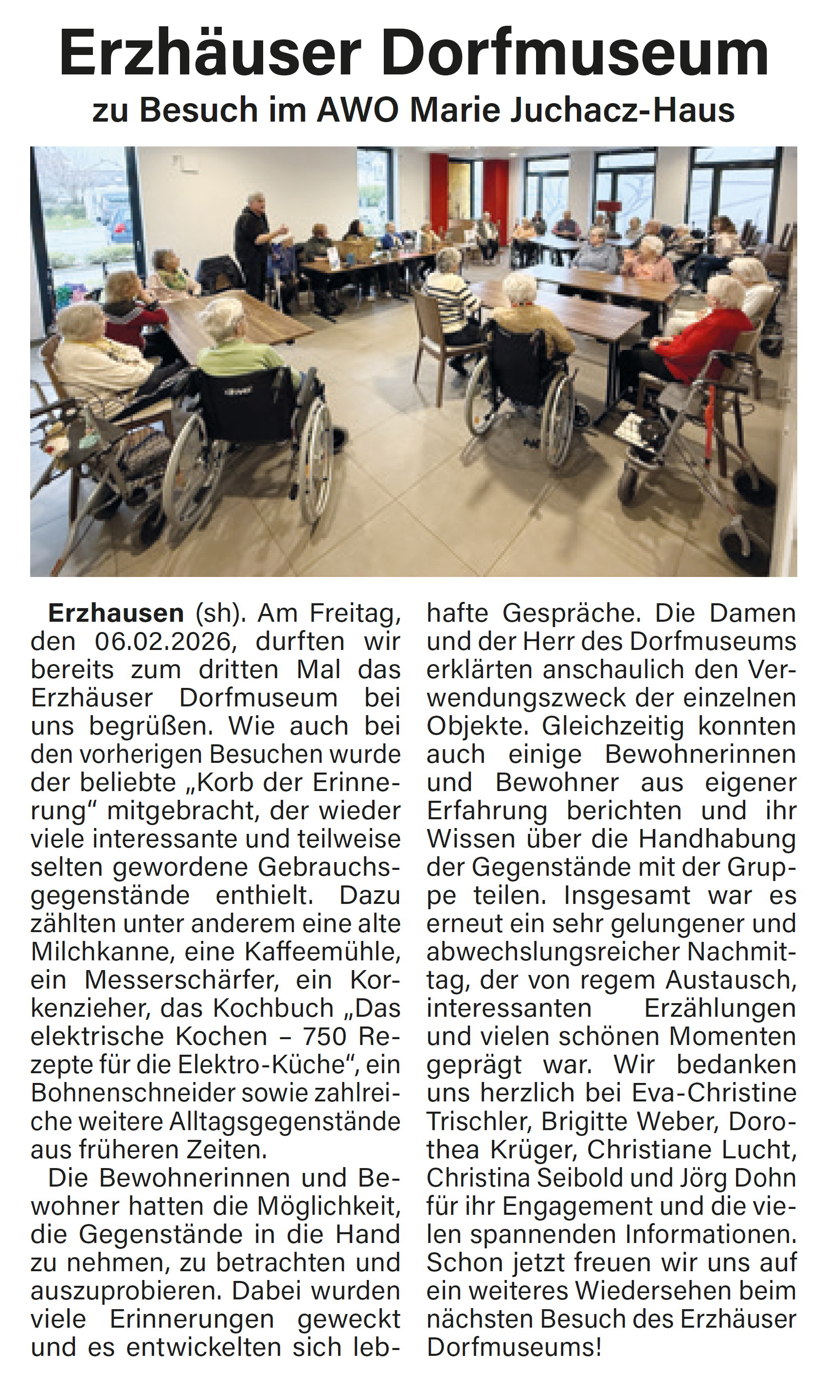 Das Dorfmuseum Erzhausen beherbergt unter anderem auch einen kostbaren Schatz an Exponaten, die vom dörflichen Alltag vor und nach dem Zweiten Weltkrieg erzählen – von Haushaltsgegenständen bis hin zu bäuerlichen Arbeitsgeräten. Für die Bewohner des Marie-Juchacz-Hauses sind dies keine bloßen Museumsstücke, sondern vertraute Begleiter aus ihrer eigenen Biografie. Da der Weg ins Museum für viele Senioren heute beschwerlich ist, hat der Ortskundliche Arbeitskreis das Projekt „Koffer der Erinnerungen“ ins Leben gerufen. Dabei bringen Aktive des OAK eine sorgsame Auswahl an Exponaten direkt ins Seniorenheim. Das gemeinsame Betrachten und Berühren der Gegenstände lässt vergangene Zeiten lebendig werden und weckt wertvolle Erinnerungen an das tägliche Leben von früher. Dieses Projekt wurde vom OAK bereits mehrfach durchgeführt. Am 6. Februar 2026 war es wieder einmal so weit, eine kleine Gruppe von Aktiven des OAK kam mit einem „Koffer der Erinnerungen“ ins Seniorenheim. Christina Seibold, eine der Aktiven des OAK, beschreibt diese etwa 1-stündige Veranstaltung so: |